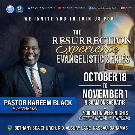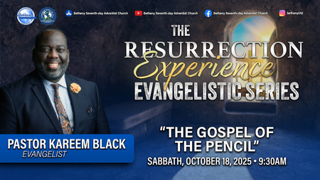 WELCOME TO BETHANY ............. WHERE RESURRECTION TAKES PLACE. ** YOU ARE INVITED TO JOIN US THIS AND EVERY SABBATH FOR OUR WORSHIP EXPERIENCE. *** TTHIS SABBATH, WE BEGIN THE RESURRECTION EXPERIENCE EVANGELISTIC SERIES WITH PASTOR KAREEM BLACK. HE WILL BE SPEAKING ON THE TOPIC, "THE GOSPEL OF THE PENCIL". SERVICES WILL BE HELD NIGHLY AT 7:00PM EXCEPT ON MONDAY AND THURSDAY NIGHTS. YOU ARE INVITED TO JOIN US AND BRING A FRIEND OR FAMILY MEMBER, AS A BLESSING AWAITS YOU!!.