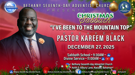 WELCOME TO BETHANY ............. WHERE RESURRECTION TAKES PLACE. ** YOU ARE INVITED TO JOIN US THIS AND EVERY SABBATH FOR OUR WORSHIP EXPERIENCE. *** THIS SABBATH IS MUSIC SABBATH AND THE FINAL SABBATH FOR THE YEAR 2025. OUR SPEAKER WILL BE PASTOR KAREEM BLACK AND HE WILL BE SPEAKING ON THE TOPIC, "I'VE BEEN TO THE MOUNTAINTOP". IT PROMISES TO BE A GRAND SPIRTUAL EXPERIENCE AND YOU ARE INVITED TO JOIN US. A BLESSING AWAITS YOU.
