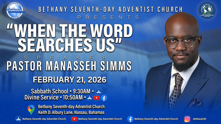 WELCOME TO BETHANY ............. WHERE RESURRECTION TAKES PLACE. ** YOU ARE INVITED TO JOIN US THIS AND EVERY SABBATH FOR OUR WORSHIP EXPERIENCE. *** THIS SABBATH OUR SPEAKER WILL BE OUR PASTOR MANASSEH SIMMS AND HE WILL BE SPEAKING ON THE TOPIC, "WHEN THE WORD SEARCHES US". WE LOOK FORWARD TO SEEING YOU IN SANCTUARY, AS A SPIRITUAL BLESSING AWAITS YOU.