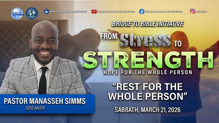 WELCOME TO BETHANY ............. WHERE RESURRECTION TAKES PLACE. ** YOU ARE INVITED TO JOIN US THIS AND EVERY SABBATH FOR OUR WORSHIP EXPERIENCE. ** THIS SABBATH WE CONTINUE WITH OUR, "BRIDGE TO BIBLE SERIES" WITH PASTOR MANASSEH SIMMS, FROM STRESS TO STRENGTH. HE WILL BE SPEAKING ON THE TOPIC "REST FOR THE WHOLE PERSON". WE LOOK FORWARD TO SEEING YOU IN SANCTUARY, AS A SPIRITUAL BLESSING AWAITS YOU. ** ADDITIONALLY, THIS SABBATH IS ALSO GLOBAL YOUTH DAY, WHERE YOU YOUTHS HIT THE STREETS TO SHARE THE LOVE OF JESUS IN A PRACTICAL WAY IN THE SURROUNDING COMMUNITY. AS A RESULT SABBATH SCHOOL LESSON STUDY WILL BEGIN AT 9:35AM AND DIVINE SERVICE AT 10:15AM. BY 11:35AM WE WOULD TAKE TO THE STREETS AND CONCLUDE AT DELEPORTE PARK. YOU ARE REQUESTED TO WEAR YOUR GLOBAL YOUTH SHIRT, BETHANY SHIRT OR ANY ROYAL BLUE SHIRT, WITH APPROPRIATE JEANS AND A COMFORTABLE PAIR OF WALKING SHOES. SEE YOU THERE AND ON TIME. GOD BLESS!
