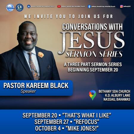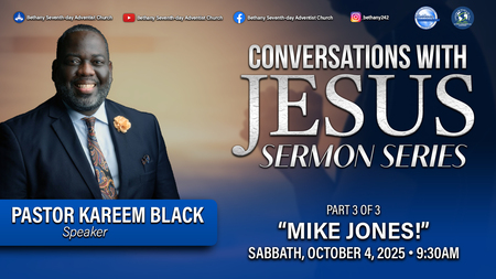 WELCOME TO BETHANY ............. WHERE RESURRECTION TAKES PLACE. ** YOU ARE INVITED TO JOIN US THIS AND EVERY SABBATH FOR OUR WORSHIP EXPERIENCE. *** THIS SABBATH, WE CONCLUDE OUR THREE-PART SERMON SERIES, "CONVERSATIONS WITH JESUS" WITH PASTOR KAREEM BLACK. HE WILL BE SPEAKING ON THE TOPIC, "MIKE JONES!". YOU ARE INVITED TO JOIN US, AS A BLESSING AWAITS YOU!!.