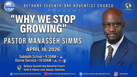 WELCOME TO BETHANY ............. WHERE RESURRECTION TAKES PLACE. ** YOU ARE INVITED TO JOIN US THIS AND EVERY SABBATH FOR OUR WORSHIP EXPERIENCE. ** THIS SABBATH OUR SPEAKER WILL BE PASTOR MANASSEH SIMMS, AND HE WILL BE SPEAKING ON THE TOPIC "WHY WE STOP GROWING". WE LOOK FORWARD TO SEEING YOU IN SANCTUARY, AS A SPIRITUAL BLESSING AWAITS YOU. ** GOD BLESS!